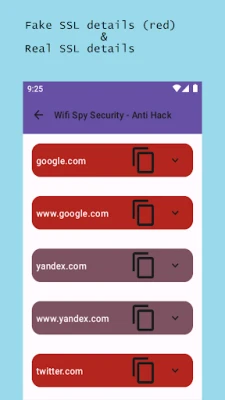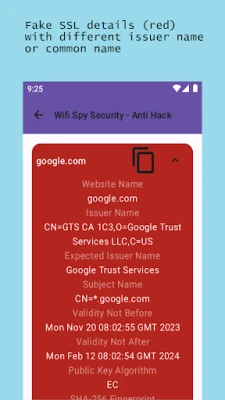 Wifi Spy Security - Anti Hack tries to determine phishing some sites if the SSL those sites are same with your own network. Because some people (wifi security hackers) are trying phishing with SSL fake websites on your wifi when it's hacked.